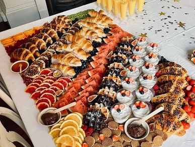This spread features fresh pastries, pancakes, and fruit. Perfect for any gathering, whether it's a casual morning get-together, a baby shower, or a corporate event.